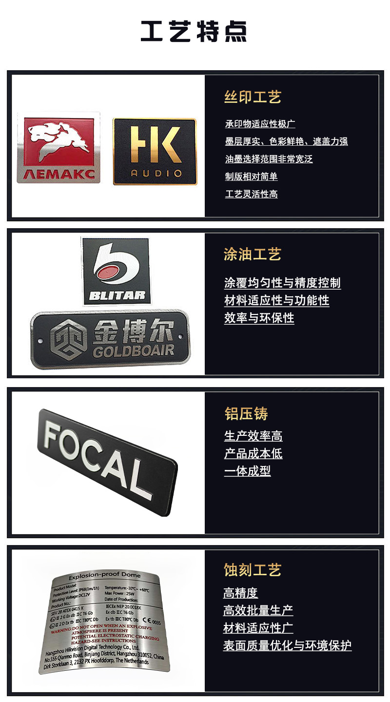 金屬鋁銘牌適用于工業機械設備、酒包裝、汽車、公共標識標牌等多種行業,鋁標牌質感高端、重量輕盈,抗氧化耐腐蝕等特點,歡迎有需要的老板咨詢我。