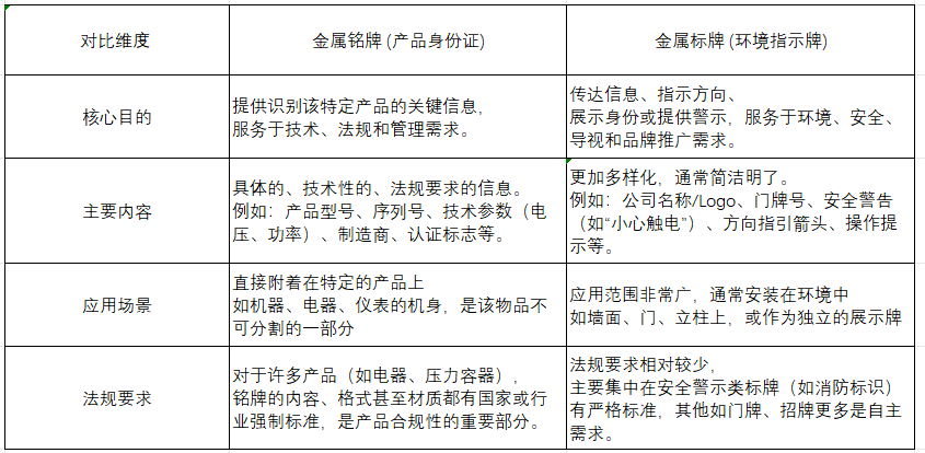 金屬銘牌和標(biāo)牌雖然都是用金屬做的,但在生活中扮演的角色完全不同。簡單來說,銘牌是產(chǎn)品的“身份證”,而標(biāo)牌是環(huán)境的“指示牌”。