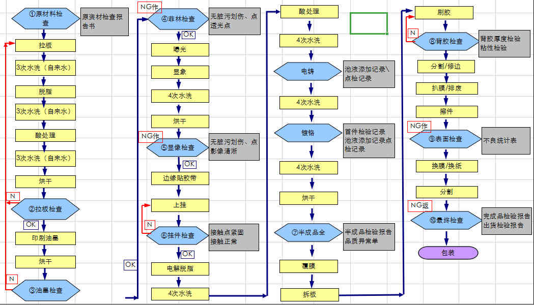 電鑄薄標生產工藝大致流程為:原材料檢查→拉板檢查→油墨檢查→菲林檢查→顯像檢查→掛件檢查→電鑄→鍍鉻→覆膜→刷膠→背膠檢查→表面檢查→最終檢查→包裝